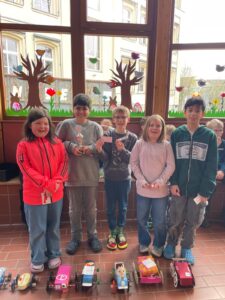 Zum Abschluss wurde es besonders spannend: Bei einem Wettrennen konnten die Fahrzeuge ihre Praxistauglichkeit unter Beweis stellen. Dabei setzte sich Fahad aus der Klasse 4a durch. Sein Fahrzeug, das mit CDs als Reifen ausgestattet war, legte eine Strecke von über 8 Metern zurück und sicherte sich damit den ersten Platz.