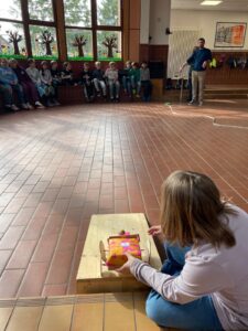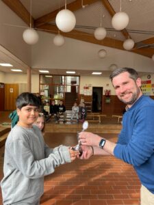 Zum Abschluss wurde es besonders spannend: Bei einem Wettrennen konnten die Fahrzeuge ihre Praxistauglichkeit unter Beweis stellen. Dabei setzte sich Fahad aus der Klasse 4a durch. Sein Fahrzeug, das mit CDs als Reifen ausgestattet war, legte eine Strecke von über 8 Metern zurück und sicherte sich damit den ersten Platz.